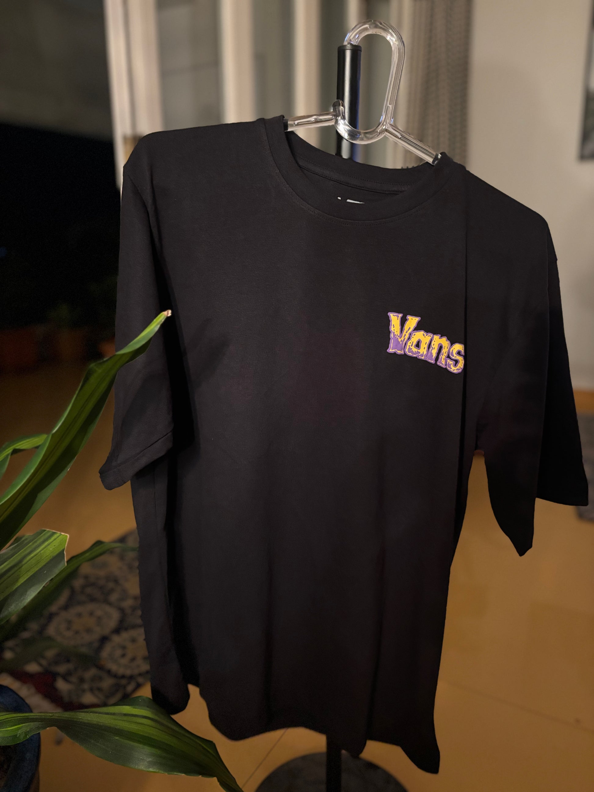 This black t-shirt screams cool with its vintage-inspired 💀 skull and ✝️ cross design. The bold yellow "Vans" lettering pops right above the awesome graphic, mixing classic 80s rock vibes with that iconic skate culture edge. 👀 Dig the details? A wicked purple and black cross is home to the skull, complete with subtle 🕸️ spiderweb accents. And of course, "Off The Wall" finishes off the legendary look. 😎